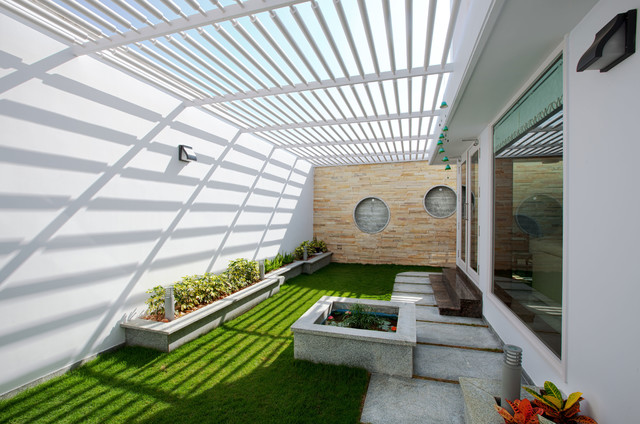 Inspiration for a contemporary patio in Other with concrete pavers and a pergola. — Houzz