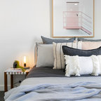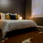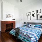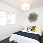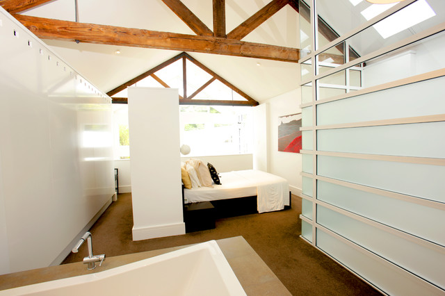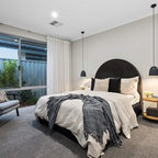 Contemporary bedroom in Sydney with white walls and carpet. — Houzz