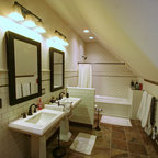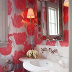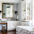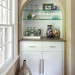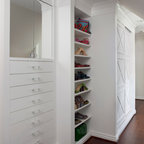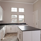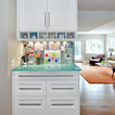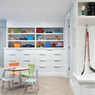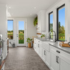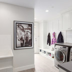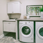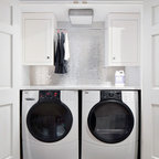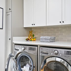This is an example of a transitional laundry room in New York with white cabinets, a side-by-side washer and dryer and white benchtop. — Houzz