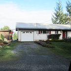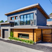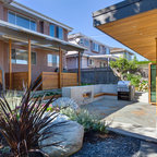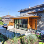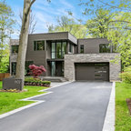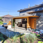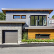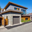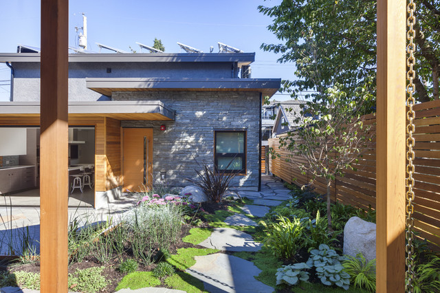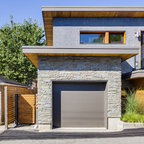 Contemporary two-storey grey exterior in Vancouver with stone veneer. — Houzz