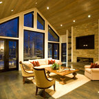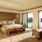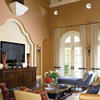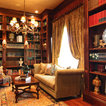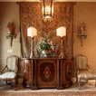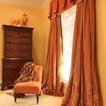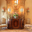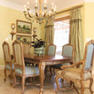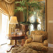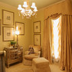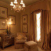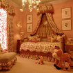 Elegant baby's nursery with mirrored furniture and sleigh bed crib (Bratt Decor), crystal chandelier (Curry & Company), custom linen Austrien sheers, custom valance and drapery panels. Crown bed corona with linen panels and swivel-rocker with ottoman (Lee Industries). Hand-colored prints in custom framing. Nelson Wilson Interiors photography.