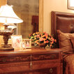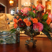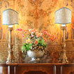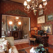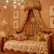 Elegant baby's nursery with mirrored furniture and sleigh bed crib (Bratt Decor), crystal chandelier (Curry & Company), custom linen Austrien sheers, custom valance and drapery panels. Crown bed corona with linen panels and swivel-rocker with ottoman (Lee Industries). Hand-colored prints in custom framing.
