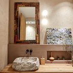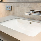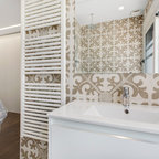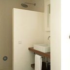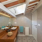 Design ideas for a mediterranean 3/4 bathroom in Barcelona with flat-panel cabinets, light wood cabinets, an alcove shower, a trough sink, an open shower, beige walls and beige floor. — Houzz