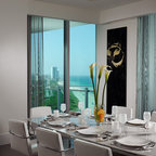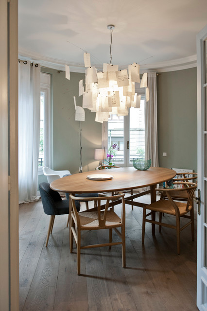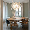 me encanta la mesa ovalada... Estilo moderno Esta espectacular vivienda de 300 metros cuadrados en Barcelona es de Meritxell Ribé y Josep Puigdomènech, directores creativos y de proyectos de Meritxell Ribé - The Room Studio. En este comedor, todo está cuidado hasta el último detalle. La mesa es de la firma Ethnicraft; las sillas son el modelo CH24, de Hans J. Wegner para Carl Hansen & Son. Al fondo, se adivina la mecedora Plastic Chair RAR, de los Eames, que edita Vitra. El conjunto lo remata la lámpara de suspensión Zettel’z 5, de Ingo Maurer, que, como ellos mismos contaban en el reportaje que publicamos de su vivienda, es una de las piezas más especiales de su casa.