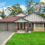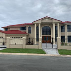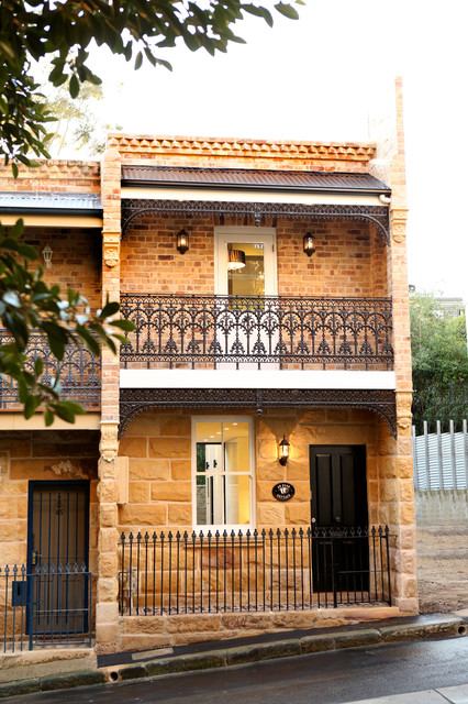 Design ideas for a large traditional beige exterior in Sydney with stone veneer. —