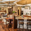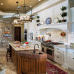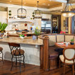 Contrasting use of the white wood work in kitchen . Then transitions back to stain work in family rm
