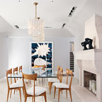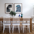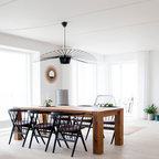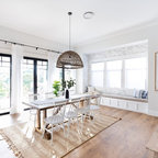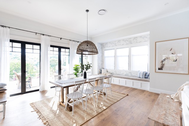 Design ideas for a country open plan dining in Brisbane with white walls, medium hardwood floors and brown floor. — Houzz