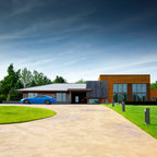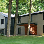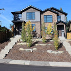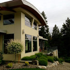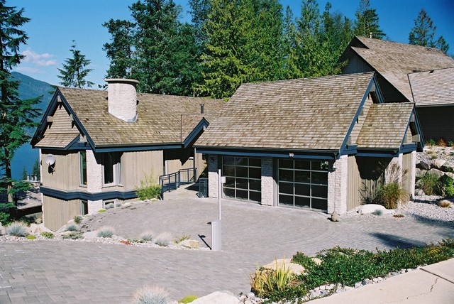 Mid-sized contemporary one-storey multi-coloured house exterior in Vancouver with mixed siding, a gambrel roof and a shingle roof. — Houzz