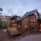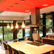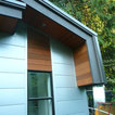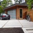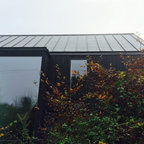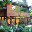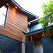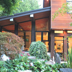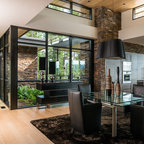 The uniquely angular footprint of the house responds to the creek along the west side of the property and the oblique property lines. In keeping with the spirit of the distinctive spaces created by these intersecting planes, the plan of the metal clad addition, and the roof lines of both additions, playfully fold and change direction. The result is a completely re-modeled home which is sleek, vibrant and connected to the site.