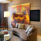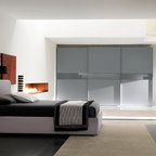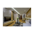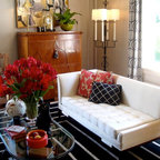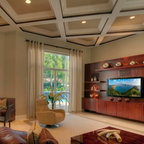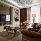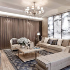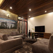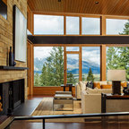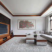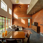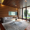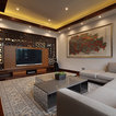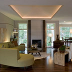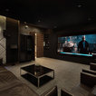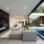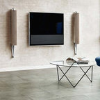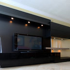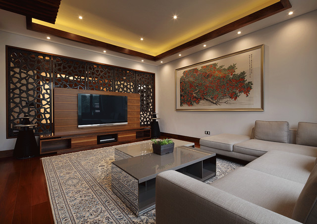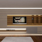 This is an example of a contemporary living room in Other with grey walls, dark hardwood floors and a wall-mounted tv. — Houzz