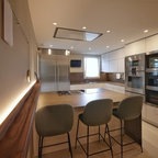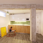 Photo of a mid-sized contemporary u-shaped eat-in kitchen in Other with an undermount sink, flat-panel cabinets, white cabinets, stainless steel appliances, concrete floors, with island, solid surface benchtops and white splashback. — Houzz
