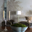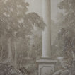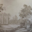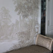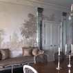 The murals are painted in grisaille, a traditional technique which uses a monochromatic palette of grey to create depth. In this case the artist used the soft painterly style of Fragonard and Boucher to create the lush landscape in the same grey palette. The freshness and vitality of the brushwork distinguishes these murals from printed wall covering. Silver leaf detailing on the pilasters adds a luminous effect.