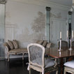 The project is a series of mural panels painted in the artist’s studio and installed on all walls of a dining room. The imagery is of soft landscape with classical architectural elements, loosely based on an Arcadian 18th century French wallpaper scenic.