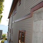 Design ideas for a large contemporary grey house exterior in Vancouver with mixed siding, a hip roof and three or more storeys. — Houzz
