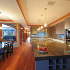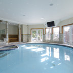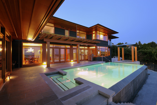 Large contemporary backyard rectangular infinity pool in Vancouver with a hot tub and tile. — Houzz