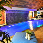 We like the clean lines and warm woods, but would prefer more stone. This is a bit too contemporary. We like the infinity edge pool.