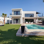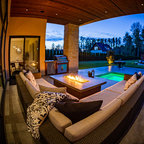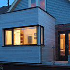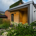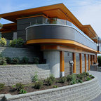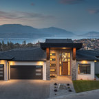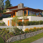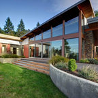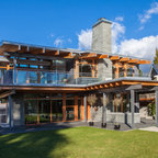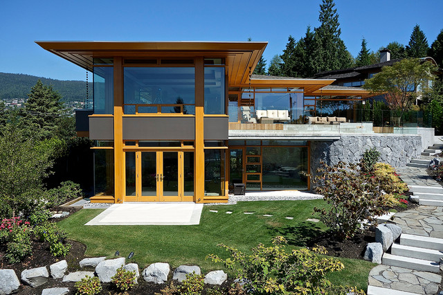 Inspiration for a contemporary two-storey glass house exterior in Vancouver with a hip roof. — Houzz
