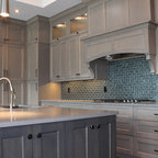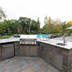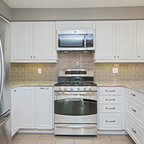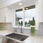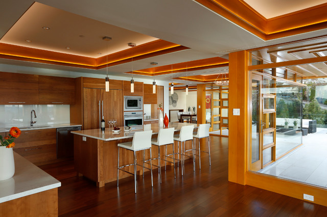 Photo of a large contemporary l-shaped eat-in kitchen in Vancouver with an undermount sink, flat-panel cabinets, medium wood cabinets, quartzite benchtops, white splashback, stone slab splashback, stainless steel appliances, medium hardwood floors, with island and brown floor. — Houzz