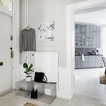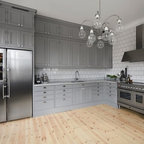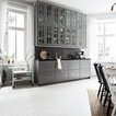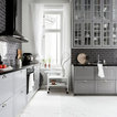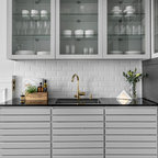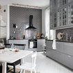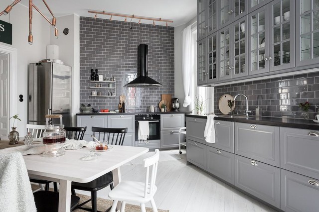 Design ideas for a mid-sized scandinavian l-shaped eat-in kitchen in Stockholm with glass-front cabinets, grey cabinets, grey splashback, subway tile splashback, black appliances, painted wood floors and no island. — Houzz