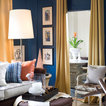 navy wall with yellow curtains and back and white graphic rug.