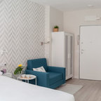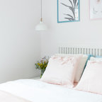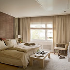 Photo of a mid-sized scandinavian bedroom in Other with white walls and no fireplace. — Houzz