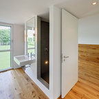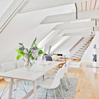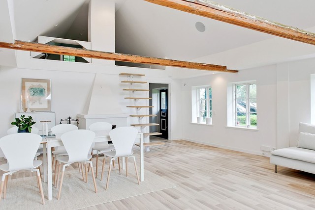 This is an example of a scandinavian dining room in Malmo with white walls, light hardwood floors and beige floor. — Houzz