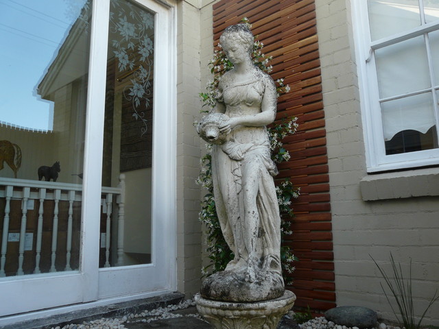 Everything in the garden is chosen to create the overall effect, nothing is left to chance. Even the flashing that looks pretty nasty, the black colour has worn off, fits into the overall scene, matching the patina on the statue. Some of the mould on the statue was removed with a pressure hose and some left to blend in with the worn out areas where the underlying aggregate is showing through.