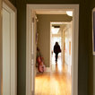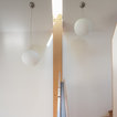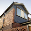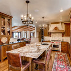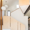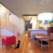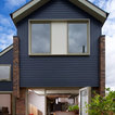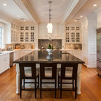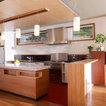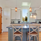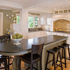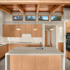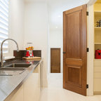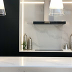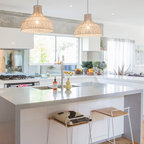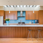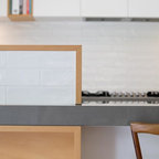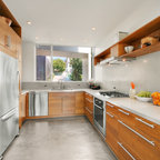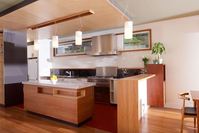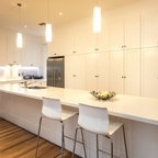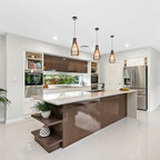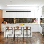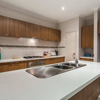 Photo of a contemporary l-shaped kitchen in Melbourne with a drop-in sink, flat-panel cabinets, medium wood cabinets, black splashback, mosaic tile splashback, white appliances, medium hardwood floors, with island, brown floor and white benchtop. — Houzz