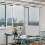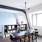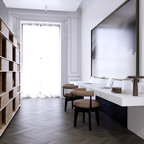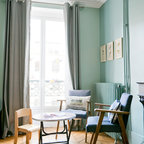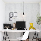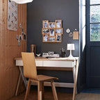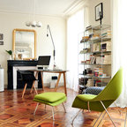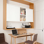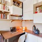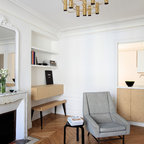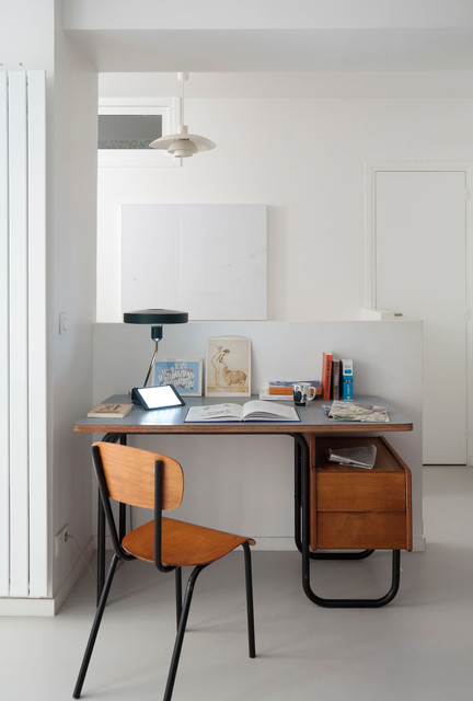Photo of a contemporary study room in Paris with white walls, a freestanding desk and grey floor. — Houzz