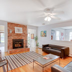 Small contemporary formal open concept living room in London with grey walls, light hardwood floors and beige floor. — Houzz