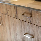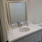 All mirror, undermount sink. Now imagine vanity is greyed walnut and floor is travertine. Pebble tile in shower with fixed screen.