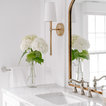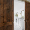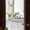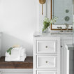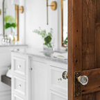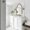 We utilized a Moroccan inspired mirror to accentuate and play with the unusual slanted roof line. By adding clean lines and ample drawers for storage, we were able to transform this outdated bathroom into a true modern master retreat.