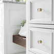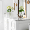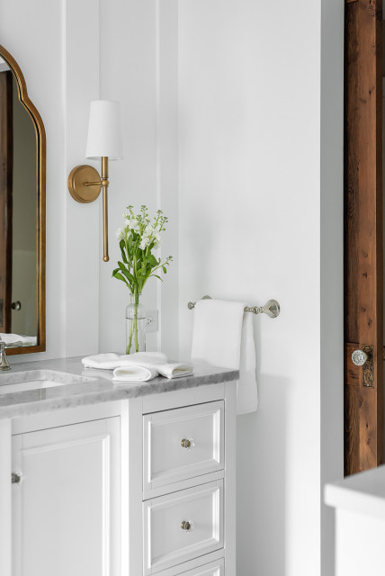 Design ideas for a mid-sized traditional master bathroom in Chicago with recessed-panel cabinets, white cabinets, a curbless shower, a two-piece toilet, white tile, subway tile, white walls, marble floors, an undermount sink, marble benchtops, white floor, a hinged shower door and white benchtops. — Houzz