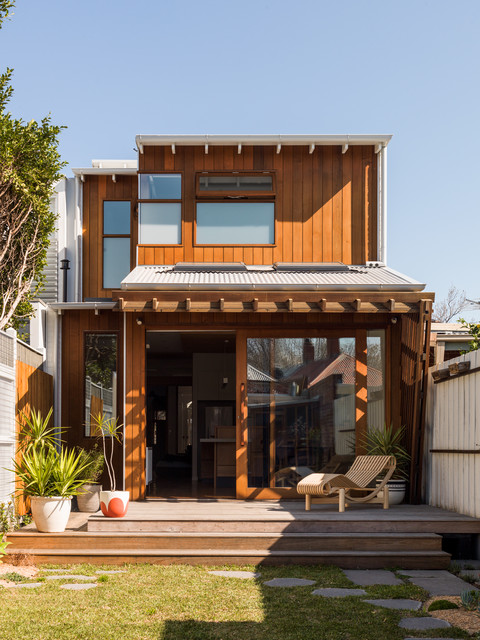 This is an example of a contemporary two-storey brown house exterior in Melbourne with wood siding, a shed roof and a metal roof. —