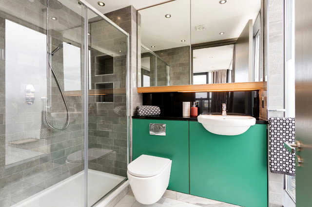 This is an example of a mid-sized contemporary master bathroom in Dublin with flat-panel cabinets, a wall-mount toilet, gray tile, porcelain tile, grey walls, porcelain floors, granite benchtops, grey floor, black benchtops, green cabinets, a corner shower, a drop-in sink and a sliding shower screen. — Houzz