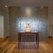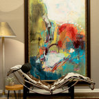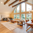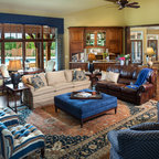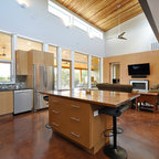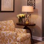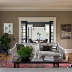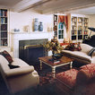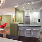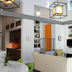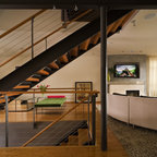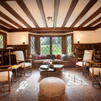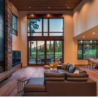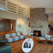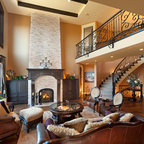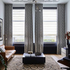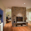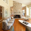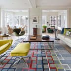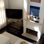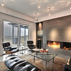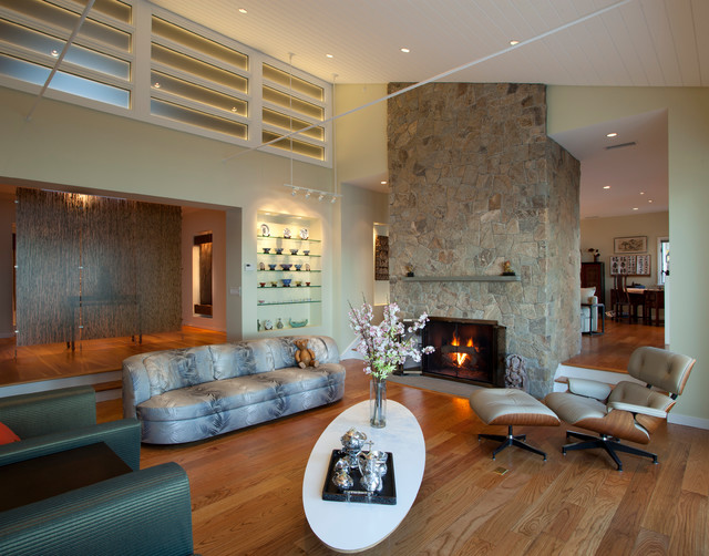 Photo of a contemporary living room in New York with beige walls, a standard fireplace and a stone fireplace surround. — Houzz