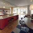 This family's jackets and coats go in the cubbies to the right. Upstairs is the kitchen dining area. And straight ahead is the family play space.