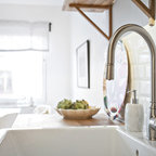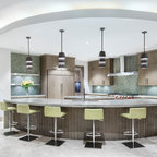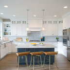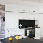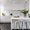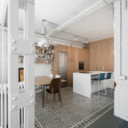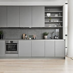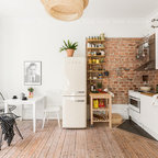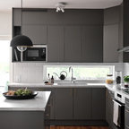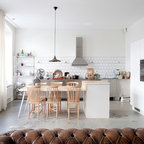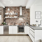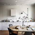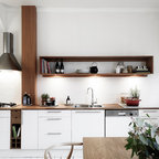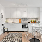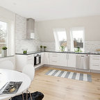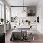 Mid-sized scandinavian l-shaped open plan kitchen in Gothenburg with flat-panel cabinets, white cabinets, stainless steel appliances, a peninsula, laminate benchtops and dark hardwood floors. — Houzz