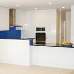 This is an example of an expansive contemporary u-shaped open plan kitchen in Adelaide with a drop-in sink, flat-panel cabinets, white cabinets, granite benchtops, blue splashback, glass sheet splashback, stainless steel appliances, ceramic floors, a peninsula and beige floor. — Houzz
