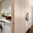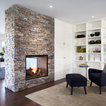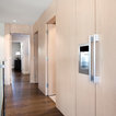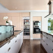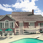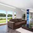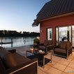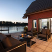 like the dark windows and the whole flow of the deck into the main area and the look out over the water. bold colours and nice patio furniture.