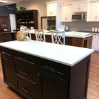 transitional, blends gray and brown tones. Like shaker cabinets and strone backsplash