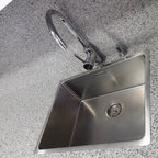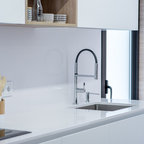 This is an example of a small modern u-shaped open plan kitchen in Seville with flat-panel cabinets, a peninsula, an undermount sink, white cabinets, quartz benchtops, grey splashback, stainless steel appliances and medium hardwood floors. — Houzz