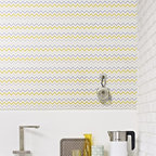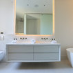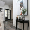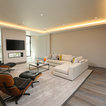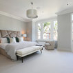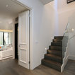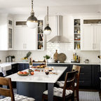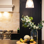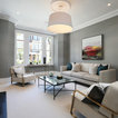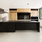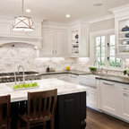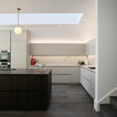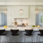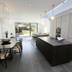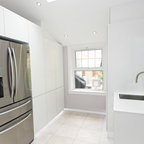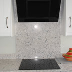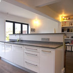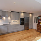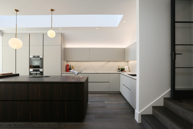 Photo of a mid-sized contemporary l-shaped kitchen in London with an undermount sink, grey cabinets, white splashback, marble splashback, stainless steel appliances, dark hardwood floors, with island, brown floor and white benchtop. — Houzz