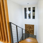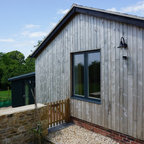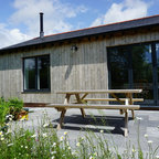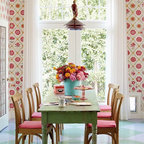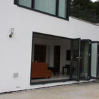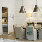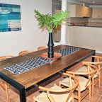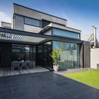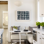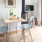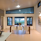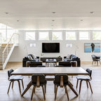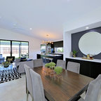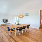 Photo of a mid-sized contemporary open plan dining in Melbourne with white walls, medium hardwood floors and no fireplace. — Houzz