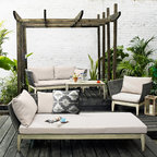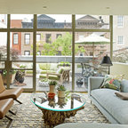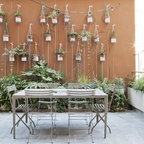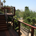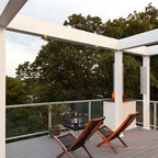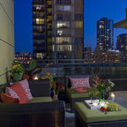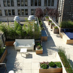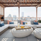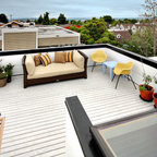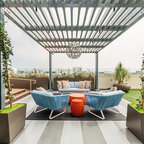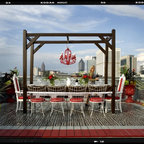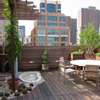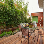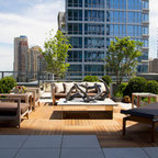 ipe deck, outdoor fireplace, teak furniture, planters, container garden, steel windows, roof deck, roof terrace