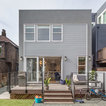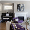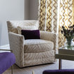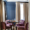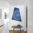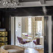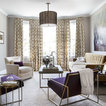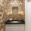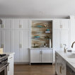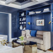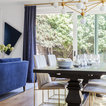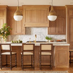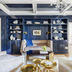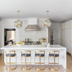 In the center of the kitchen is a waterfall island with classic marble countertop, oversized brass geometric pendants, and blue faux leather stools with brass frames. The tile backsplash behind the oven is a geometric marble with metallic inlay which creates a glamorous patterning.