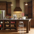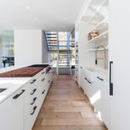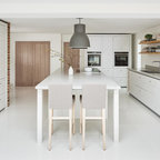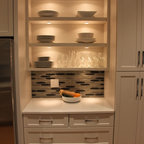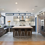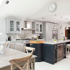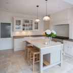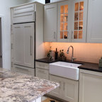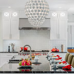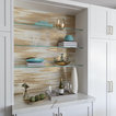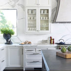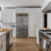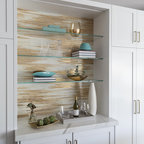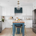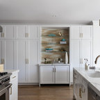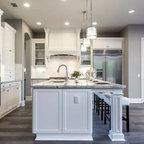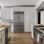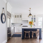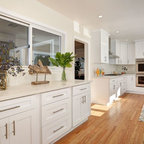 Inspiration for a large transitional u-shaped open plan kitchen in San Francisco with white cabinets, multi-coloured splashback, glass tile splashback, stainless steel appliances, with island, an undermount sink, shaker cabinets, light hardwood floors, marble benchtops and brown floor. — Houzz