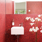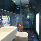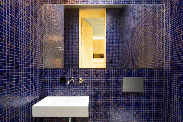 Design ideas for a small contemporary bathroom in Leipzig with blue tile, mosaic tile and a wall-mount sink. — Houzz