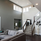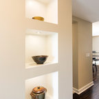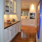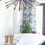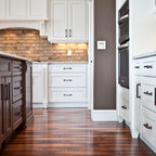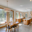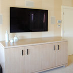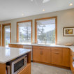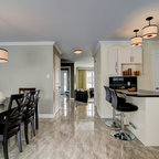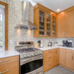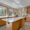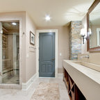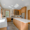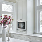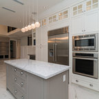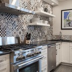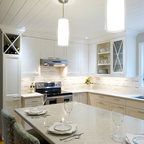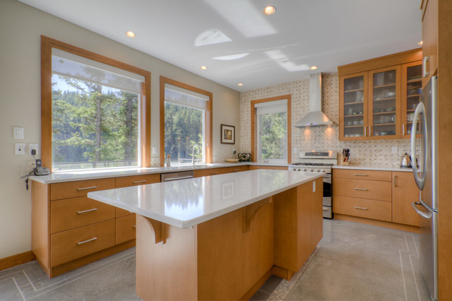 Inspiration for a large transitional u-shaped separate kitchen in Other with an undermount sink, flat-panel cabinets, light wood cabinets, quartzite benchtops, beige splashback, mosaic tile splashback, stainless steel appliances, concrete floors, with island, grey floor and beige benchtop. — Houzz