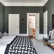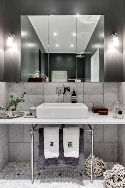 Photo of a mid-sized scandinavian master bathroom in Stockholm with gray tile, black walls, a console sink, mosaic tile floors and marble benchtops. — Houzz